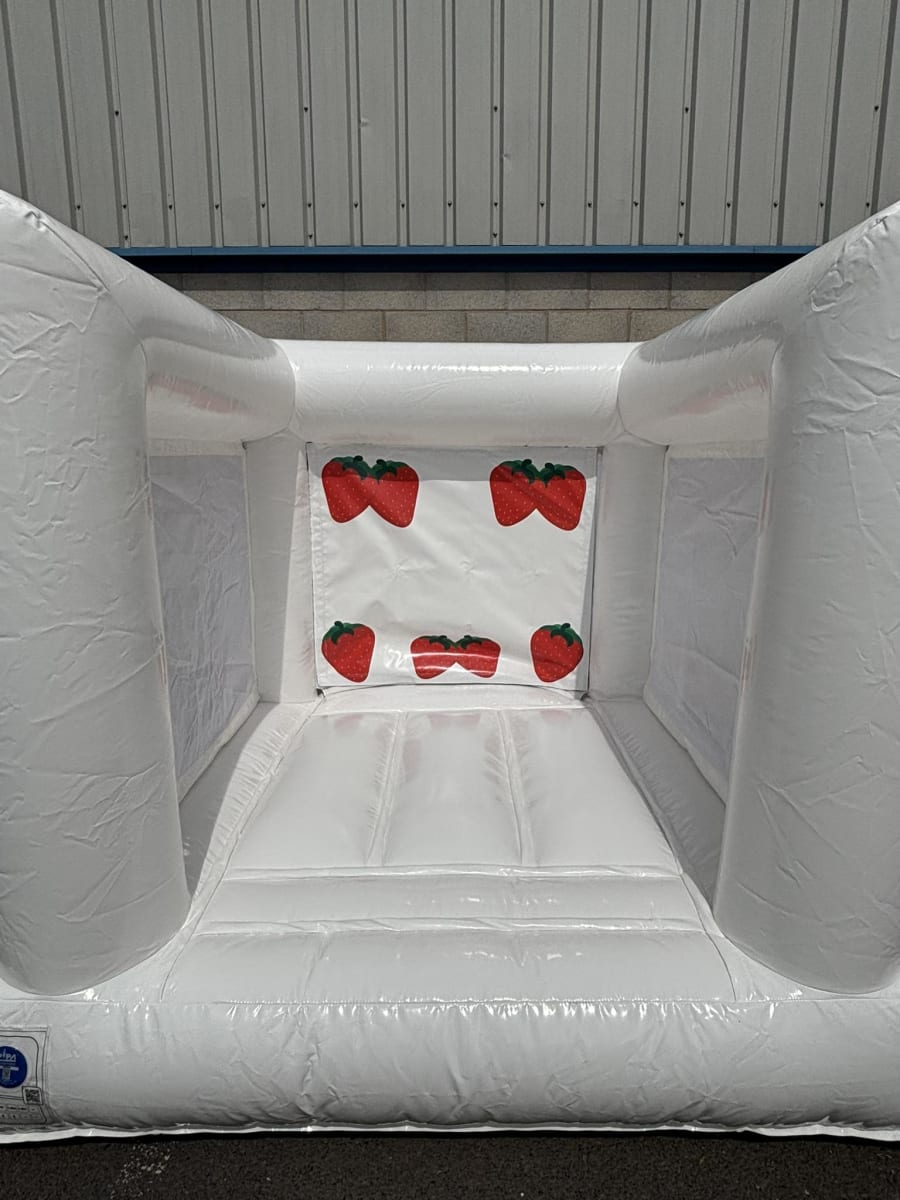 ✨ Mini Very Berry Bouncy Castle – sparkling white design with a removable back panel featuring bold red strawberries.
