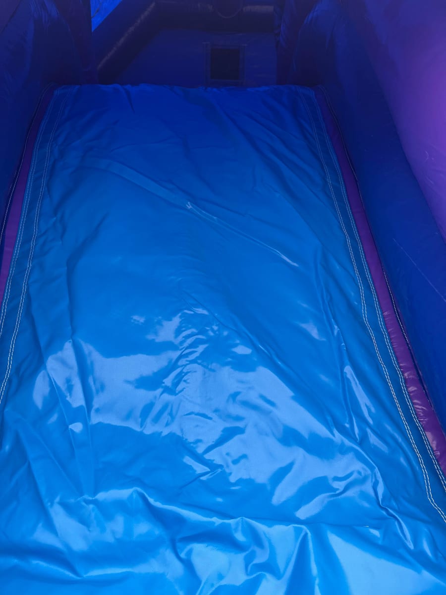 The bouncy castle has a front loading slide which standards at close to a 4ft platform (where the users bottom sits when beginning to slide). Manufactured in glossy purple and blue material, the bouncy castle unit perfectly compliments the theme of the product. Adorning the side pillars and top beam of the unit are digitally printed images of the Wednesday character.