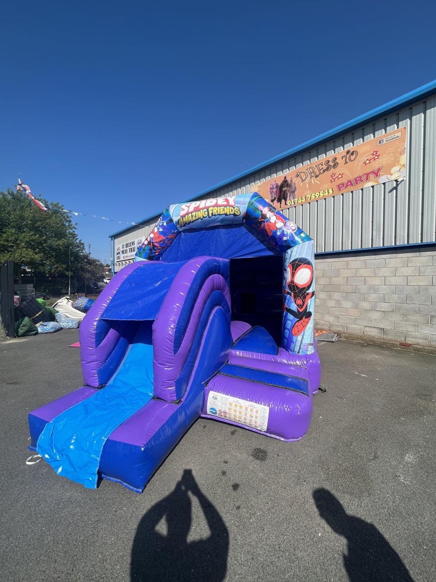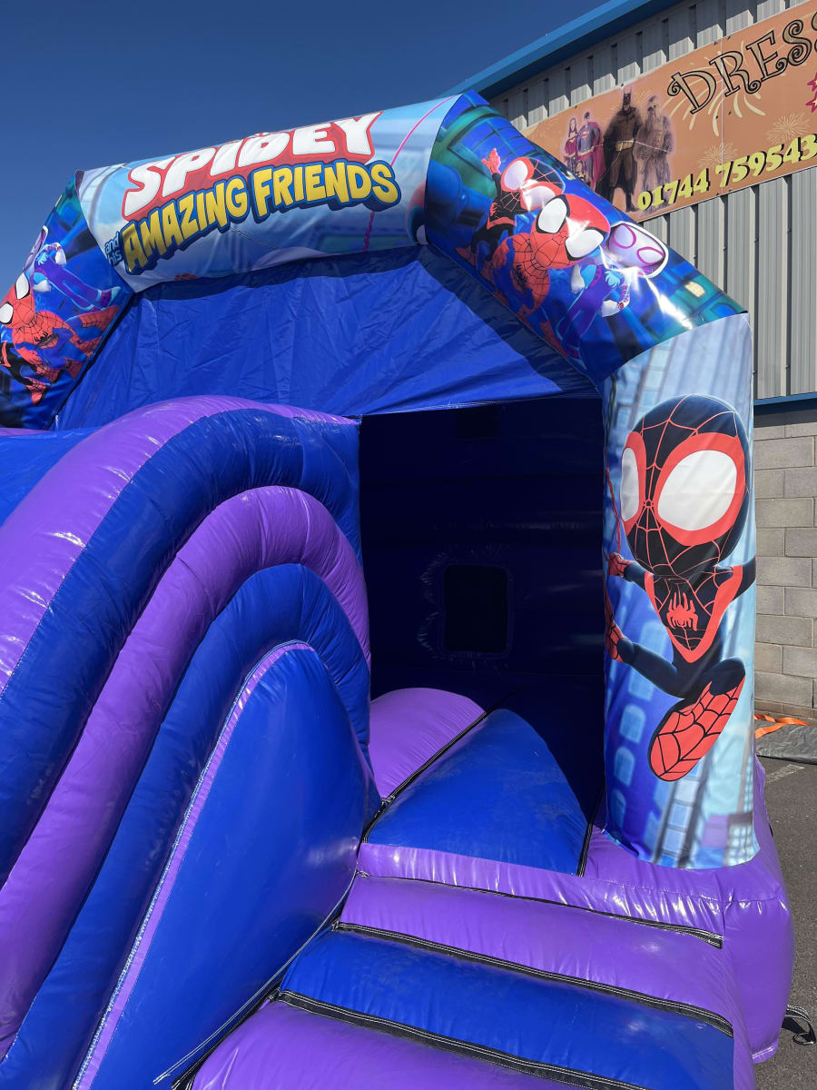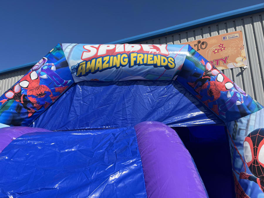 Brand new to our range of inflatable and fun products for Summer 2023 is this fantastic Spidey & His Amazing Friends bouncy castle and front slide combo.