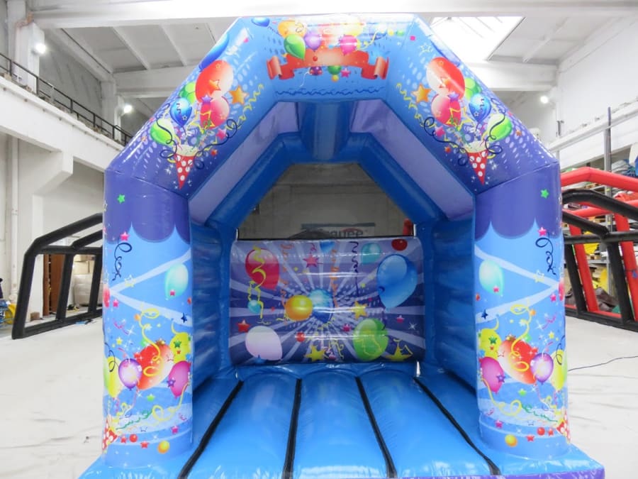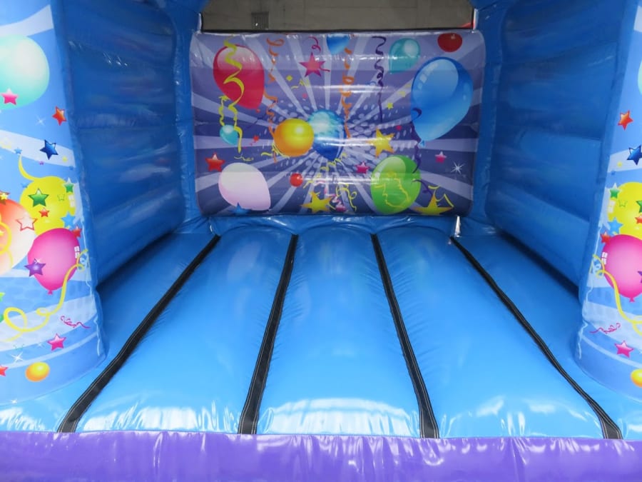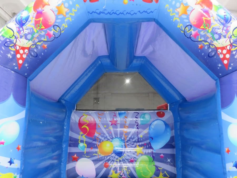 The bouncy castle is bright and cheerful and features digitally printed, flawless artwork across the top beam, side pillars and back wall of the inflatable. The artwork is of a generic party theme with balloons, streamers, banners and party poppers illustrated.