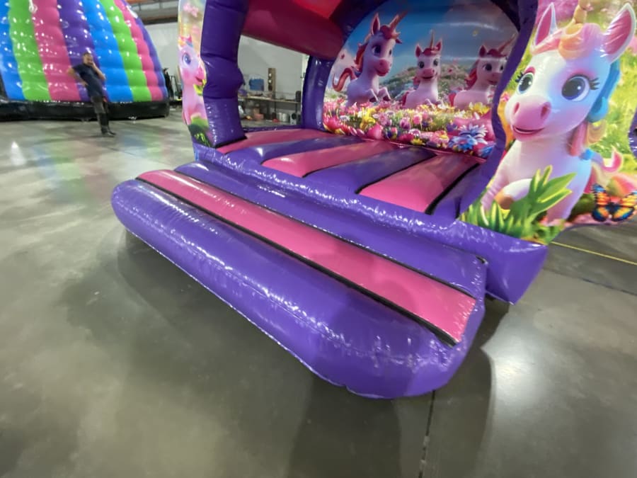 The back wall showcases high-quality digital artwork of unicorns, making it look as though they are leaping into the bouncing area, while the curved front entrance adds even more whimsical imagery to delight little ones.