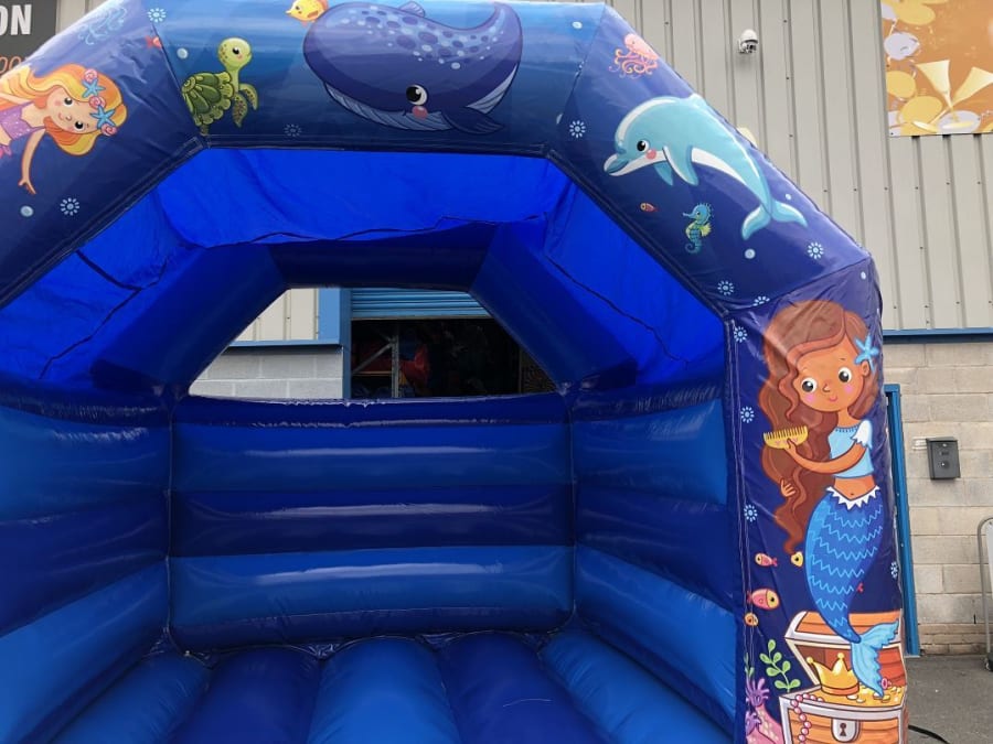Digitally printed artwork features on the front pillars of the bouncy castle and across the top beam. The artwork features generic mermaids in pink, green and blue with other aquatic items such as dolphins and fish.