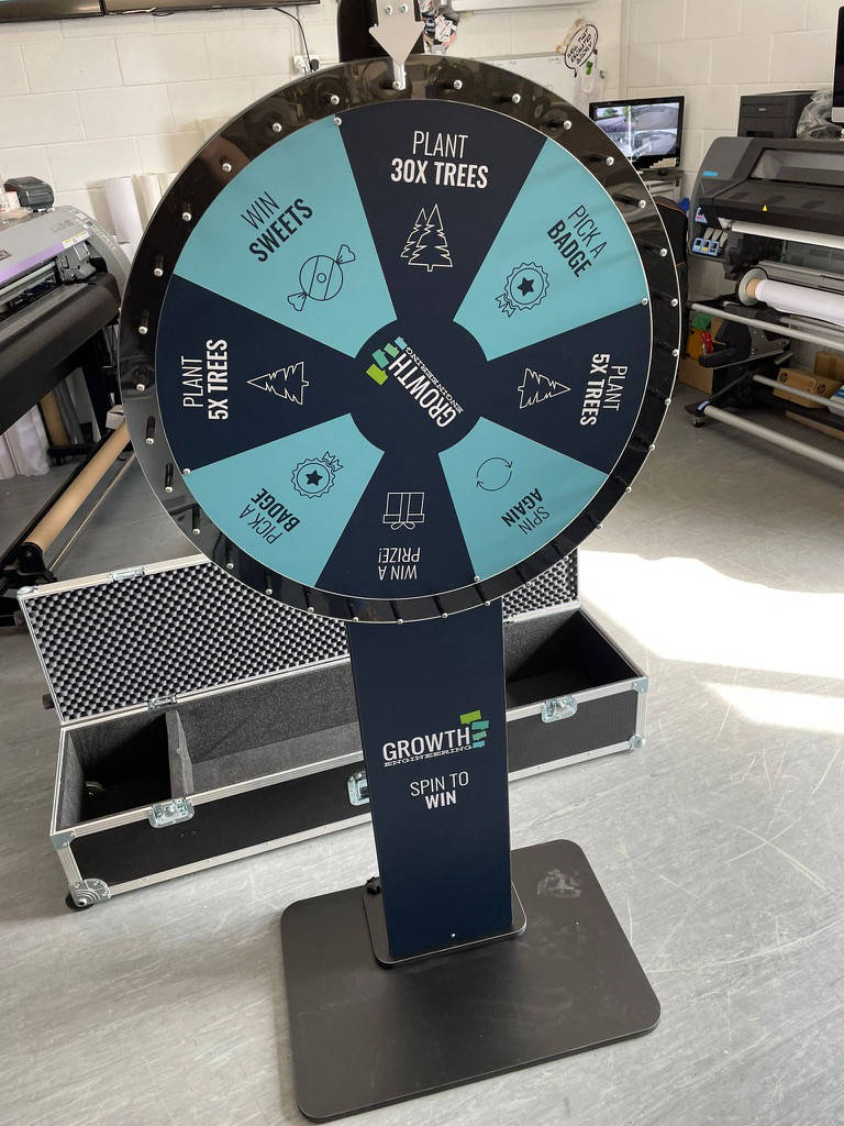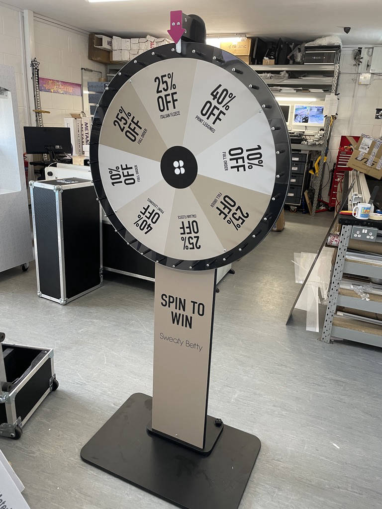 We offer an optional branding service for this product so that customers can brand the wheel and / or column to meet their needs. Users will then spin the wheel and the wheel can be designed to indicate win every time or win everytime with different prizes for different positions on the wheel or for win or loss.
