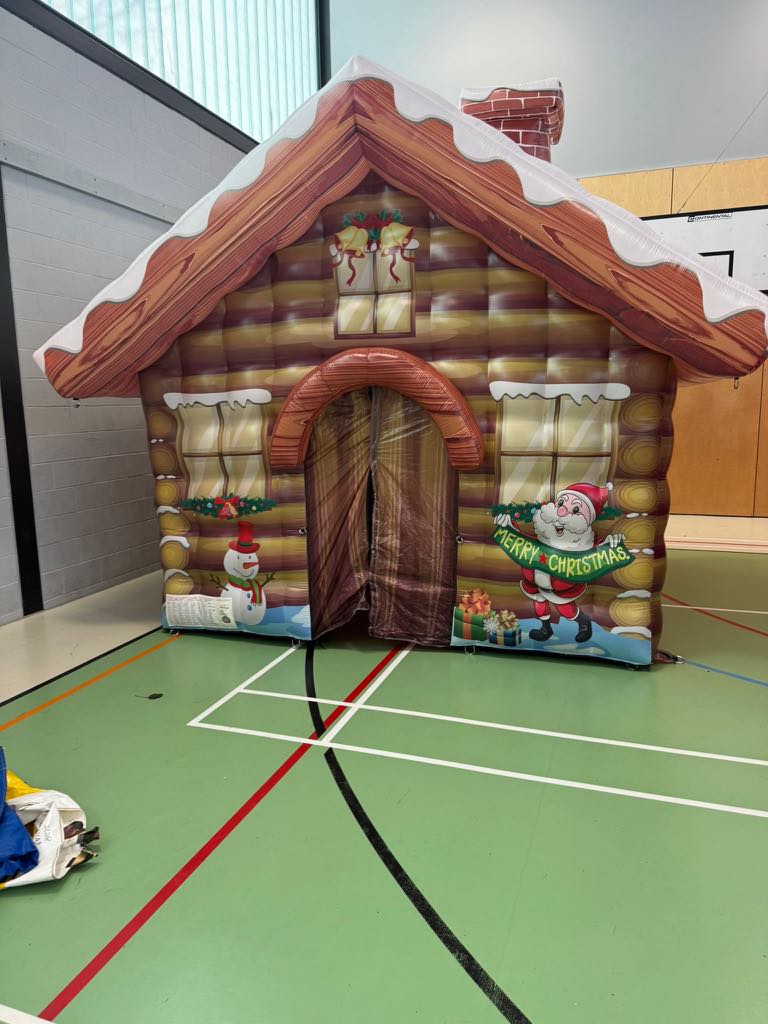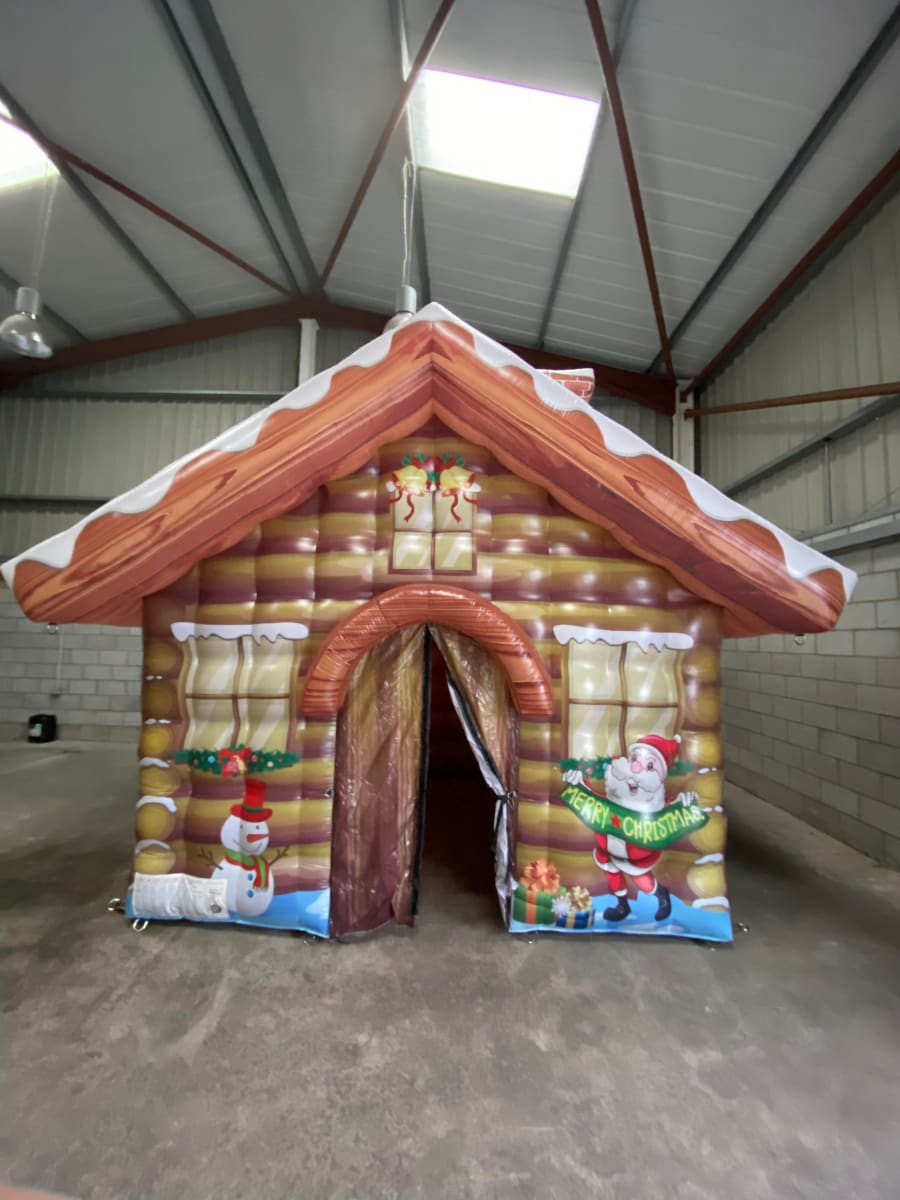 The inflatable looks fantastic with striking digital imagery decorating the front of the unit including a snow covered roof, chimney, snowman, Santa and the unit is designed to look like a traditional log cabin. Inside the inflatable, the back wall and side walls are also designed in the log cabin style, with each side wall having a roll up material window. The door can be rolled up and stored away to allow easy access to the grotto or they can be left unrolled so that the side of the grotto is unseen from the outside.