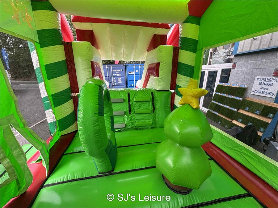 This eye-catching inflatable is designed in the style of a cosy Christmas cottage, complete with candy cane pillars, a giant red bow, a slide that kids will love, and Santa climbing down the chimney on top of the slide! Inside, little ones can bounce, climb, and explore in a safe and exciting play environment.