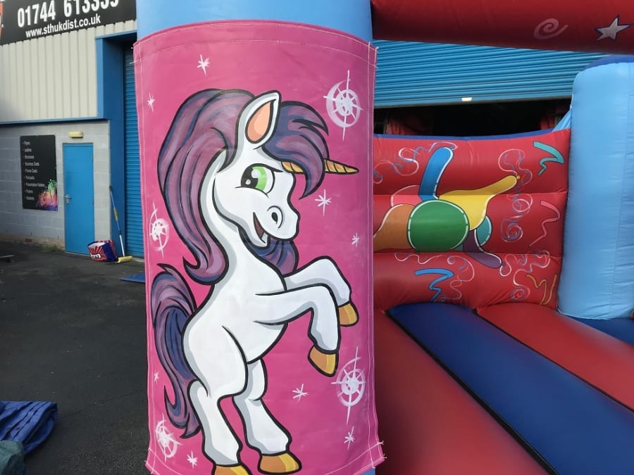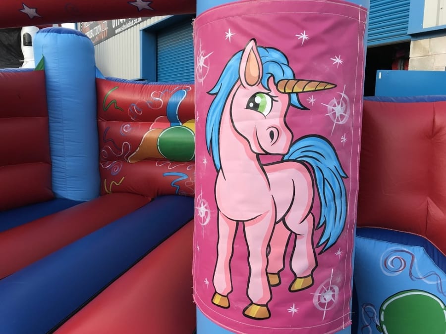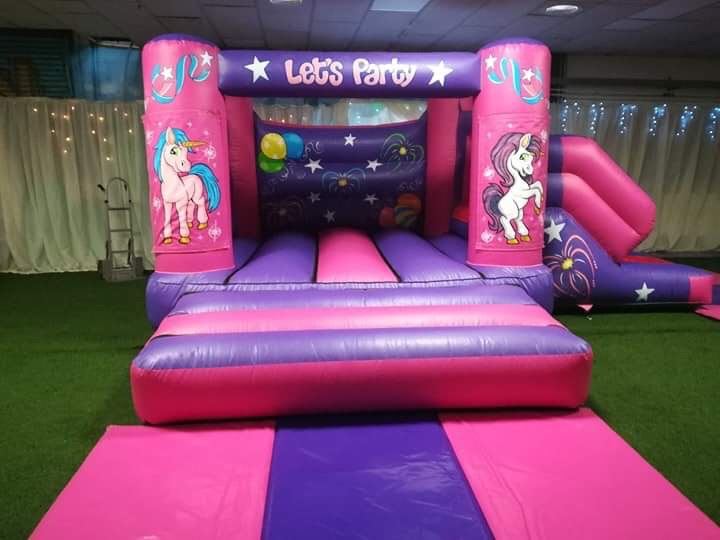 Indoor unicorn bouncy castle and slide combo hire in Warrington, St Helens, Liverpool, Cheshire and Merseyside