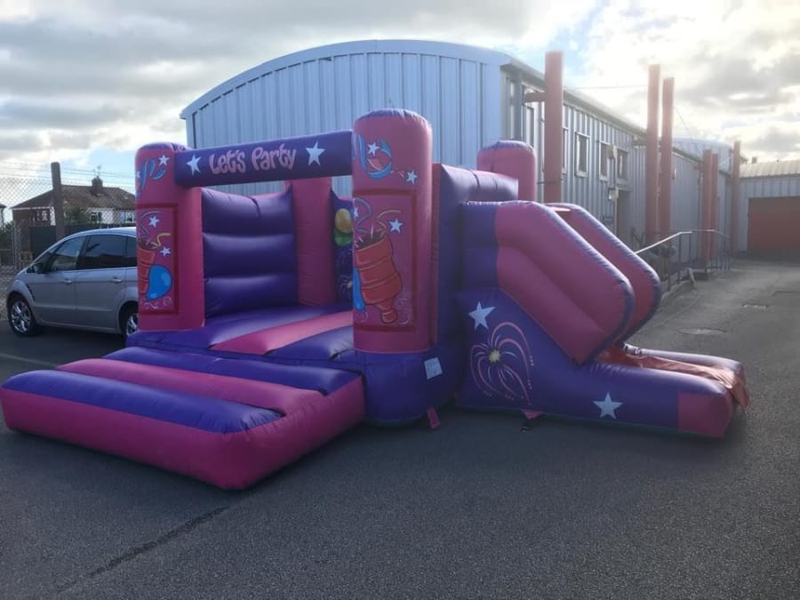 This pink and purple bouncy castle and slide combo is for indoor use only so has never faced the elements outdoors on a hire i.e. on a grassed surface, in the rain etc.