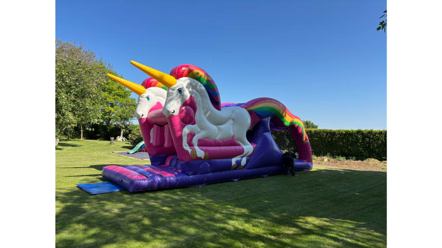 Inflatable unicorn obstacle course to hire in Warrington, St Helens, Wigan, Widnes, Leigh, Ormskirk, Liverpool and surrounding region