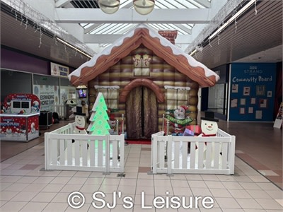 Fully dressed Inflatable Santa’s Grotto, complete with white picket fencing, fake snow scenes, wooden sleigh prop, festive presents, light-up Christmas tree signs, a vintage-style Santa throne and an organised meet-and-greet entrance with red carpet, silver stanchions and plush ropes.