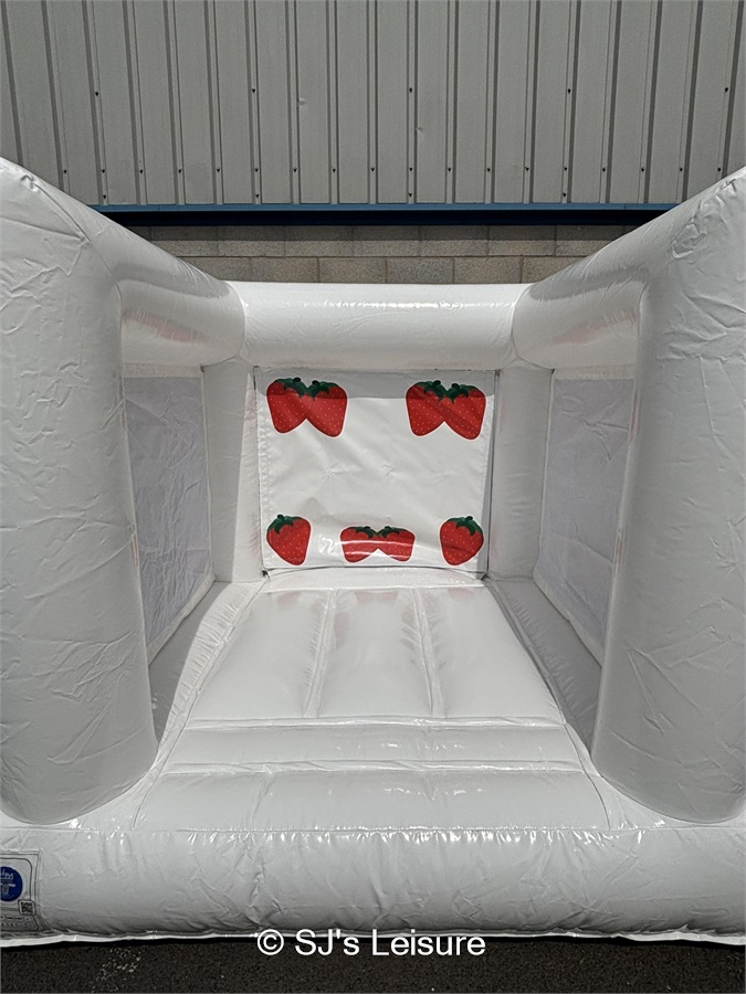 ✨ Mini Very Berry Bouncy Castle – sparkling white design with a removable back panel featuring bold red strawberries.